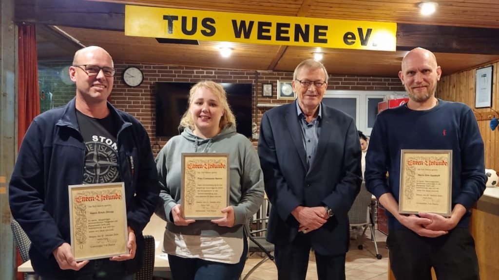Auf der 59. Jahreshauptversammlung des TuS Weene e. V., am 21. Oktober 2024 ehrte der Verein und Vorstand in Person des 1. Vorsitzenden, Harm Park, Erich, Constanze und Dirk für herausragende Leistungen und Einsatz für den Verein.
